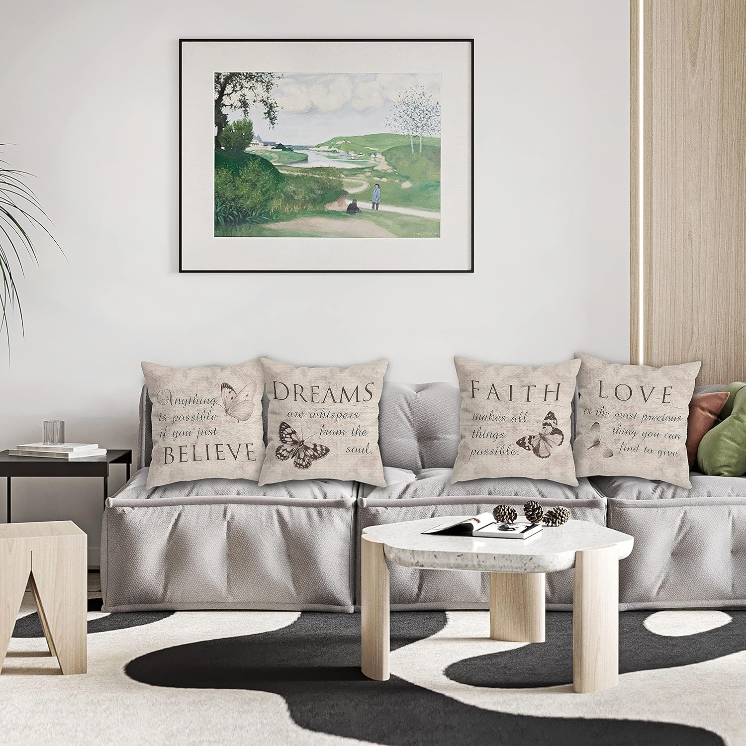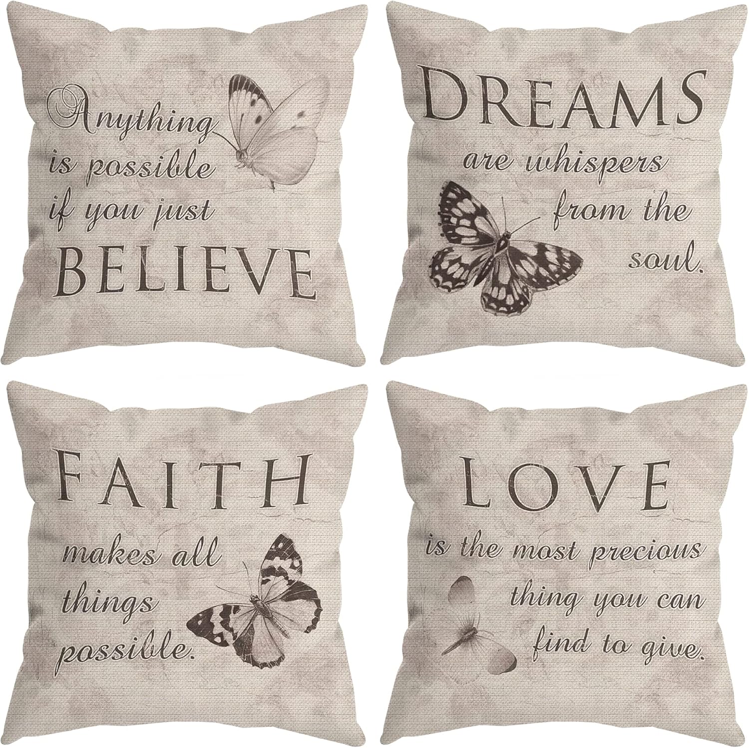 Farmhouse Rustic Butterfly Believe Dreams Faith Love Throw Pillow Covers, Inspirational Butterfly Gifts for Women, Motivational Quotes Pillow Cases 18 x 18 Inch Home Room Bed Sofa Decor Set of 4 1