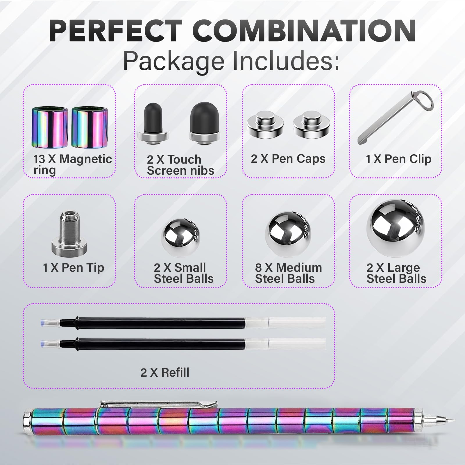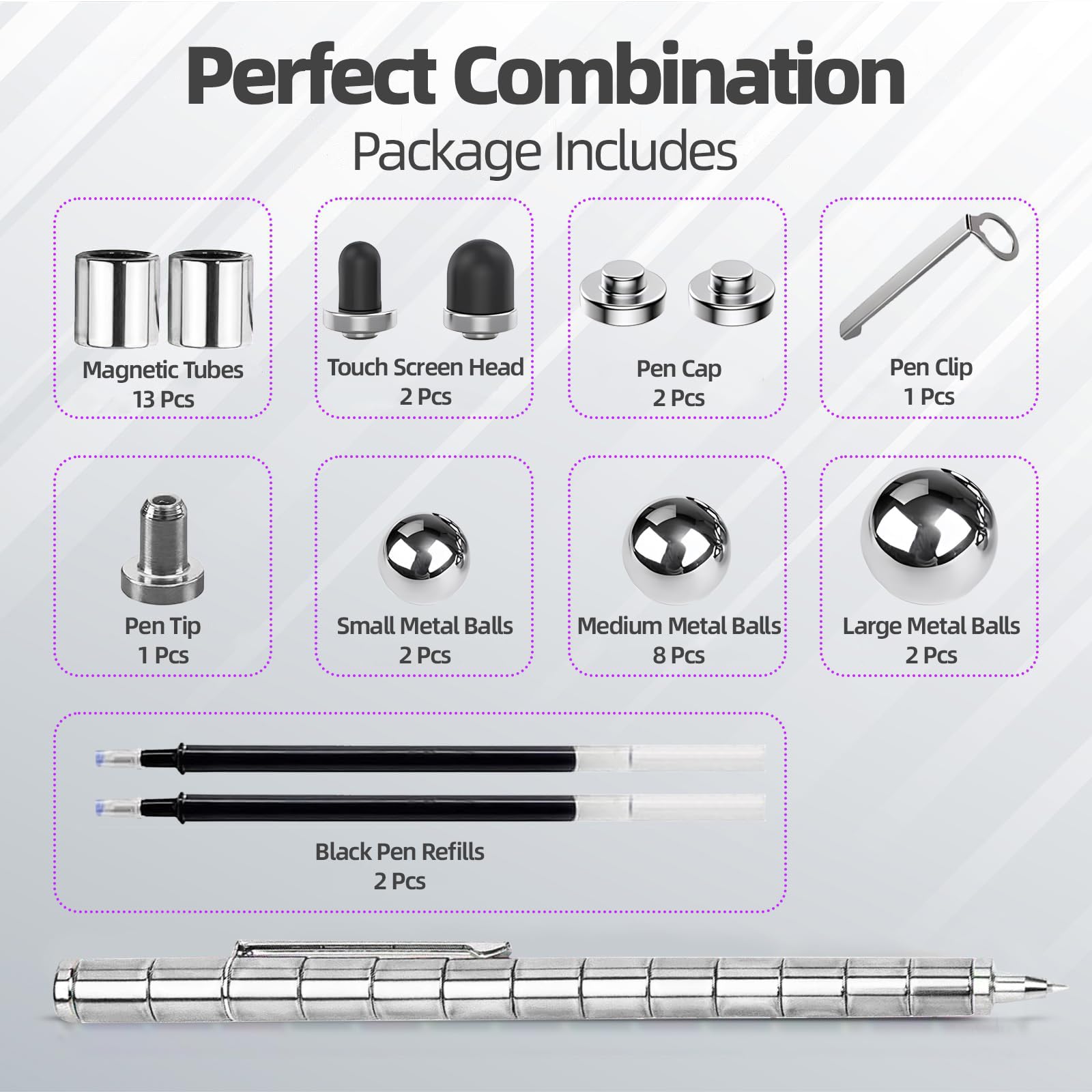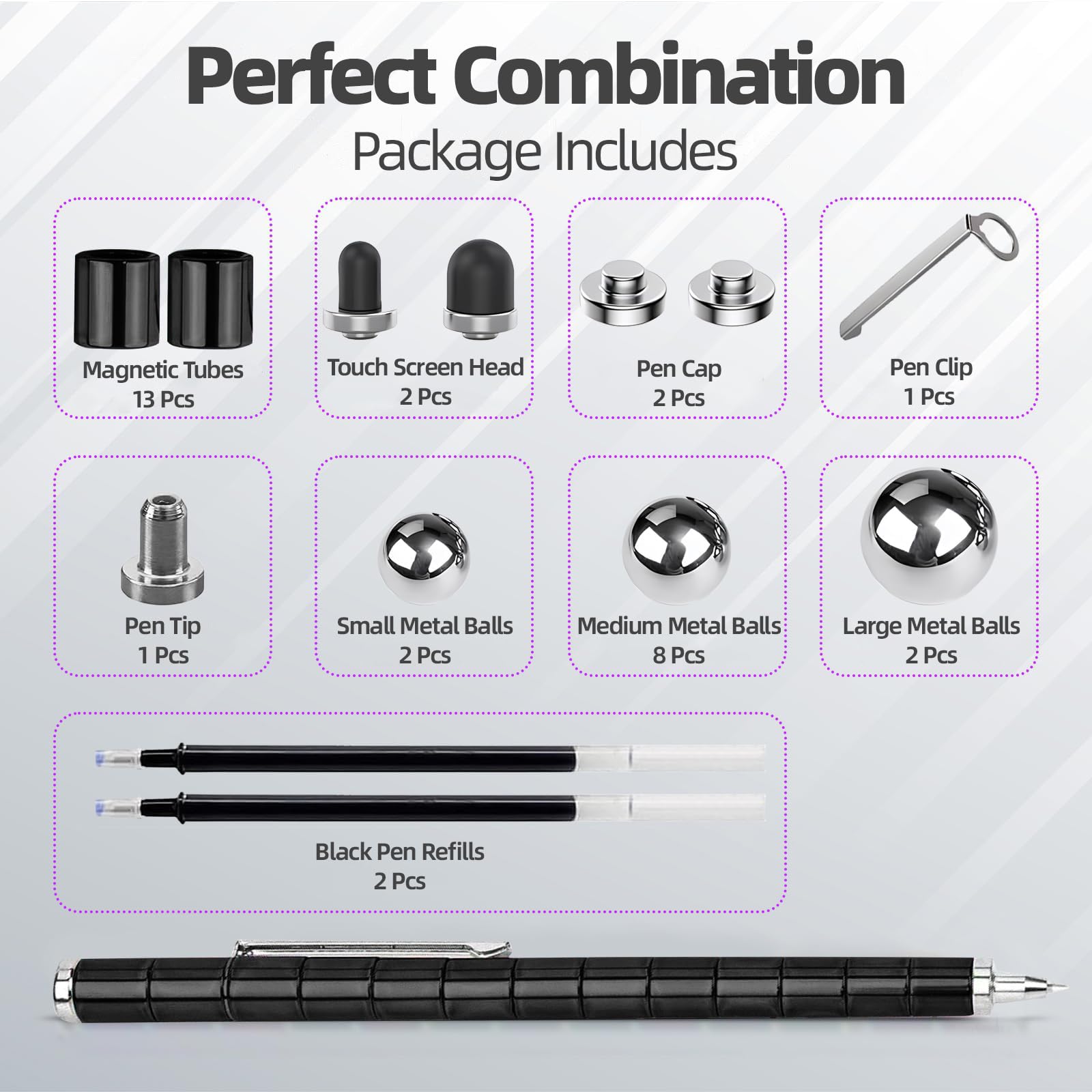 - Magnetic Pen Package Includes - 13 * Magnetic Tubes, 2 * Large Metal Balls, 8 * Medium Metal Balls, 2 * Small Metal Balls, 2 * Black Pen Refills, 2 * Touch Screen Head, 2 * Pen Cap, 1 * Pen Tip, 1 * Pen Clip, 1 * Gift box.