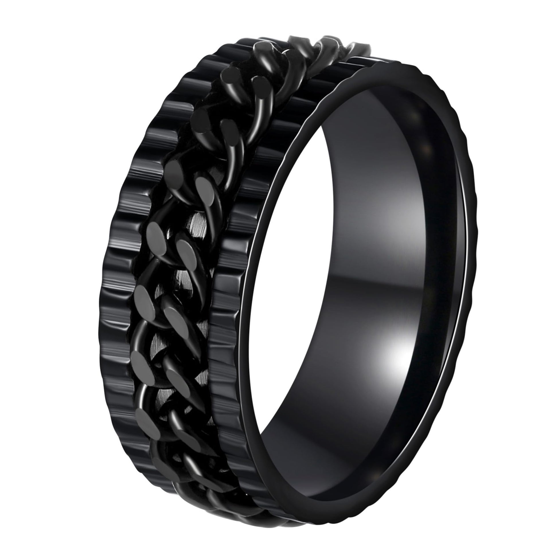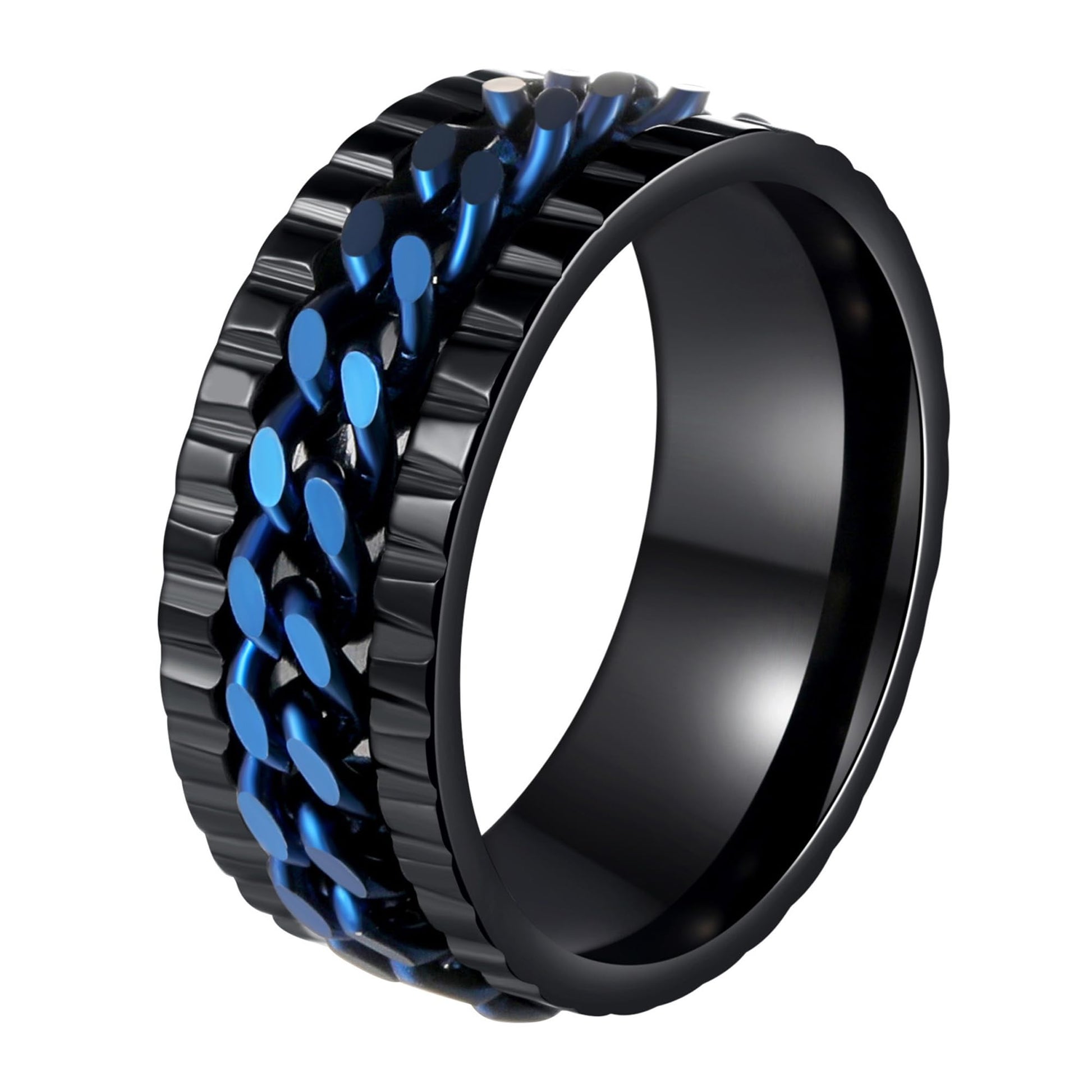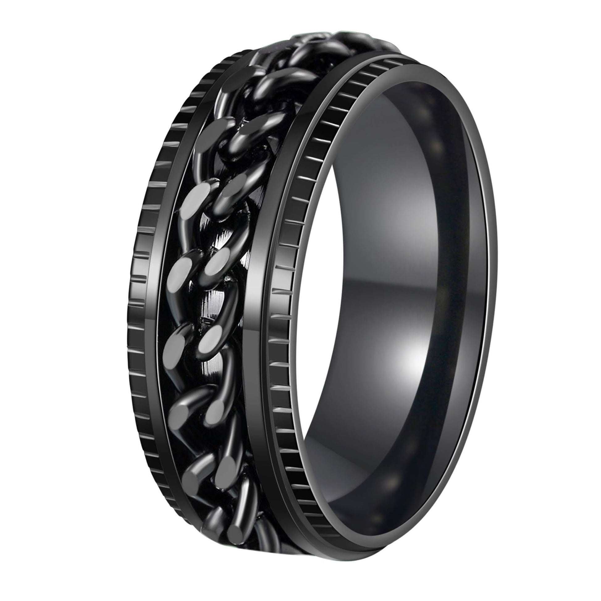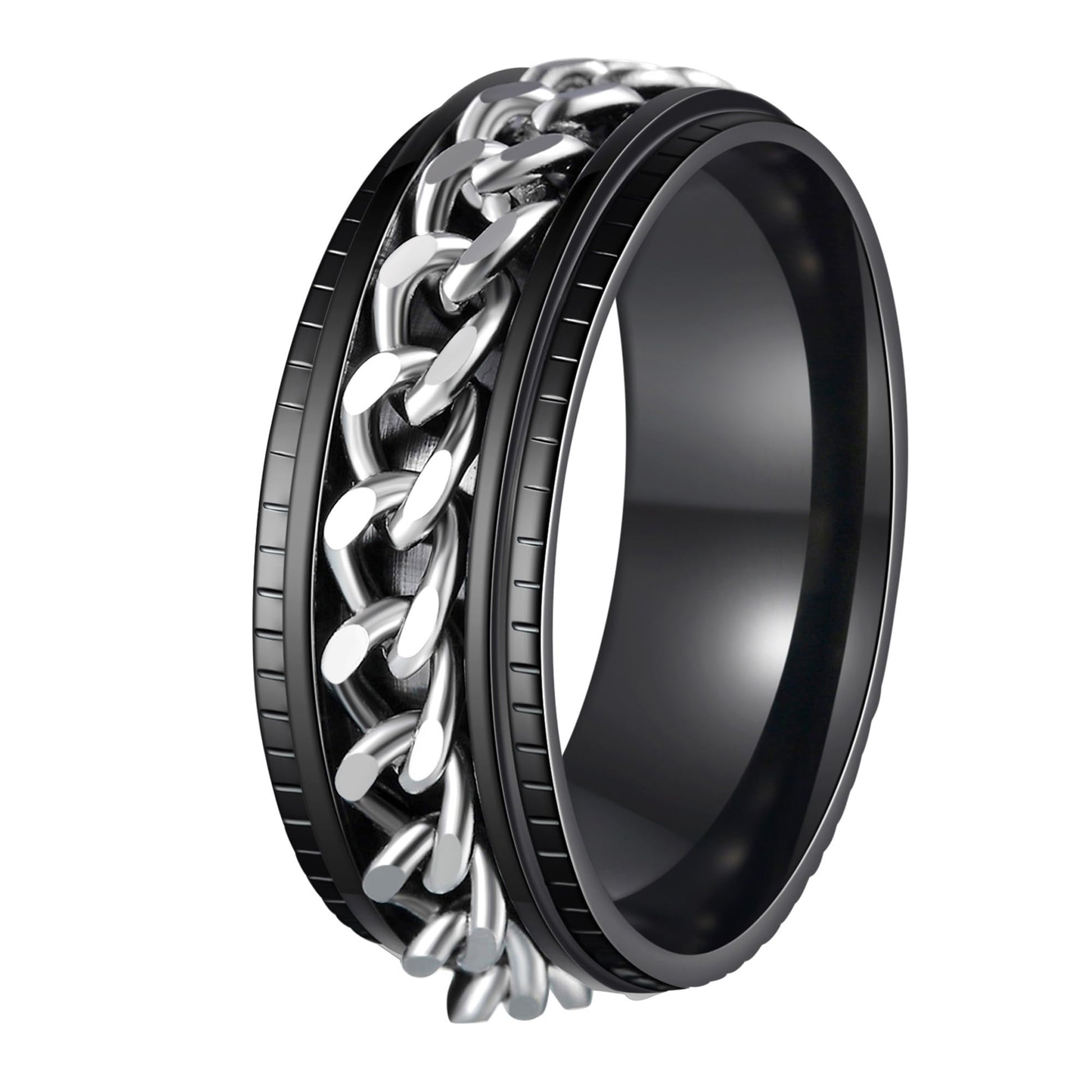 - Stress-Relief Fidget Rings: Grooved edge and curb chain inlaid design, masculine and trendy. Manually spinning the chain helps effectively relieve anxiety, stress, or other negative emotions